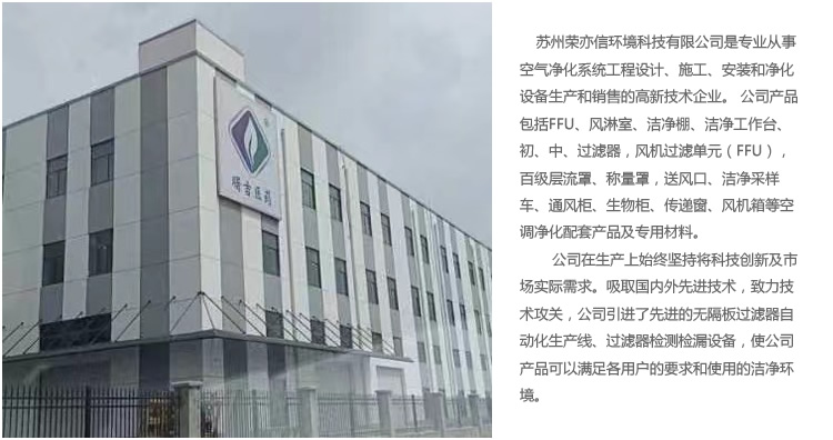 蘇州榮亦信環境科技有限公司是專業從事空氣凈化系統工程設計、施工、安裝和凈化設備生產和銷售的企業。 公司產品包括FFU、風淋室、潔凈棚、潔凈工作臺、初、中、過濾器,風機過濾單元(FFU),百級層流罩、稱量罩,送風口、潔凈采樣車、通風柜、生物安全柜、傳遞窗、風機箱等空調凈化配套產品及專用材料。公司在生產上始終堅持將科技創新及市場實際需求。吸取國內外先進技術,致力技術攻關,公司引進了先進的無隔板過濾器自動化生產線、過濾器檢測檢漏設備,使公司產品可以滿足各用戶的要求和使用的潔凈環境。公司擁有技術專業的科技人員,專業的設備制作人員,工程安裝施工人員,我公司不斷創新,不斷發展,致力于空調凈化系統的新設備、新技術的研發和生產。